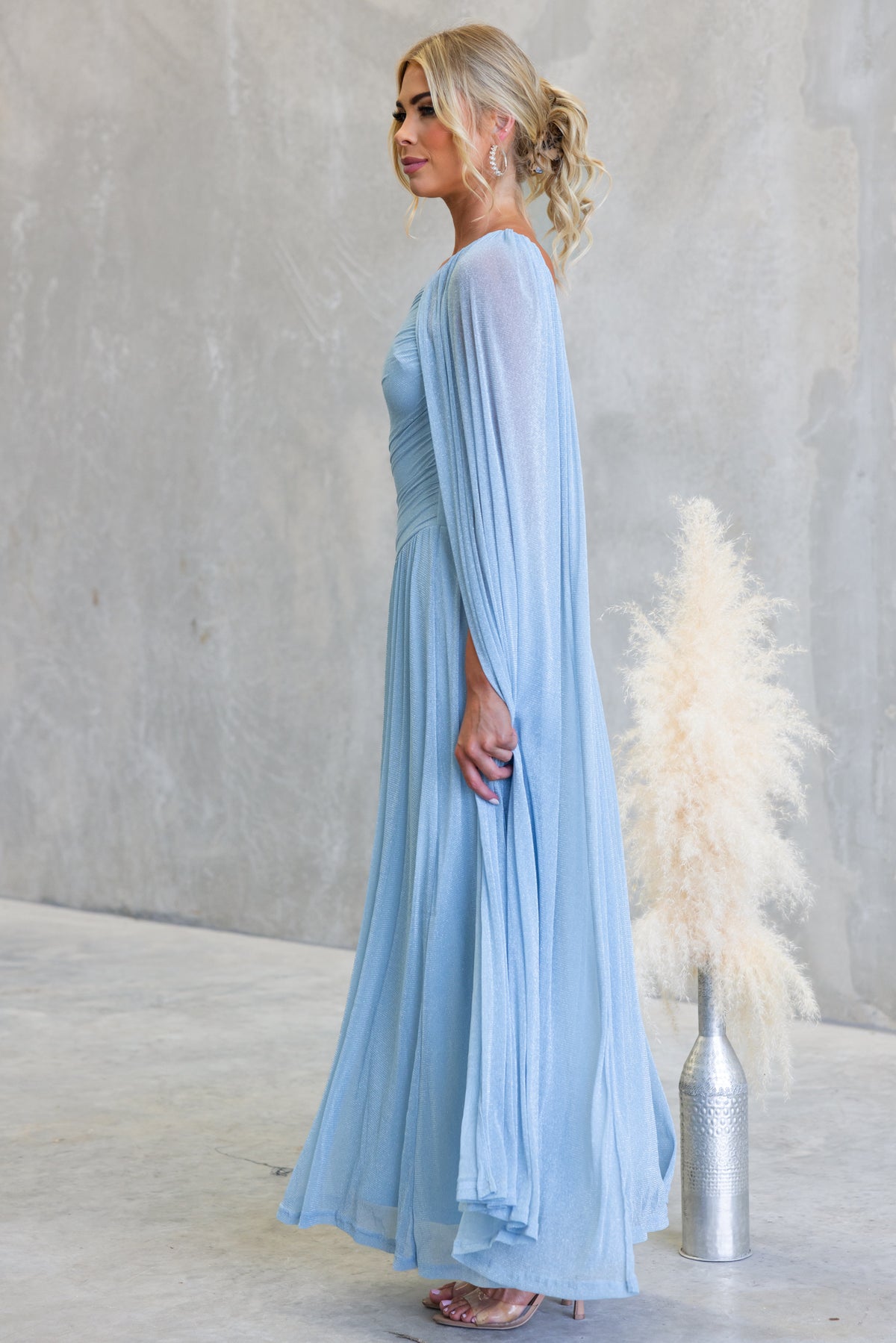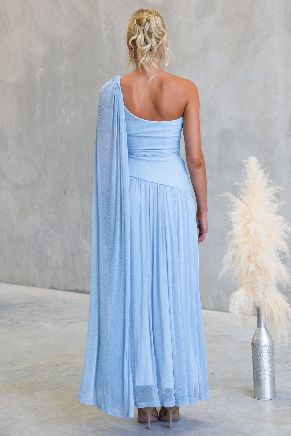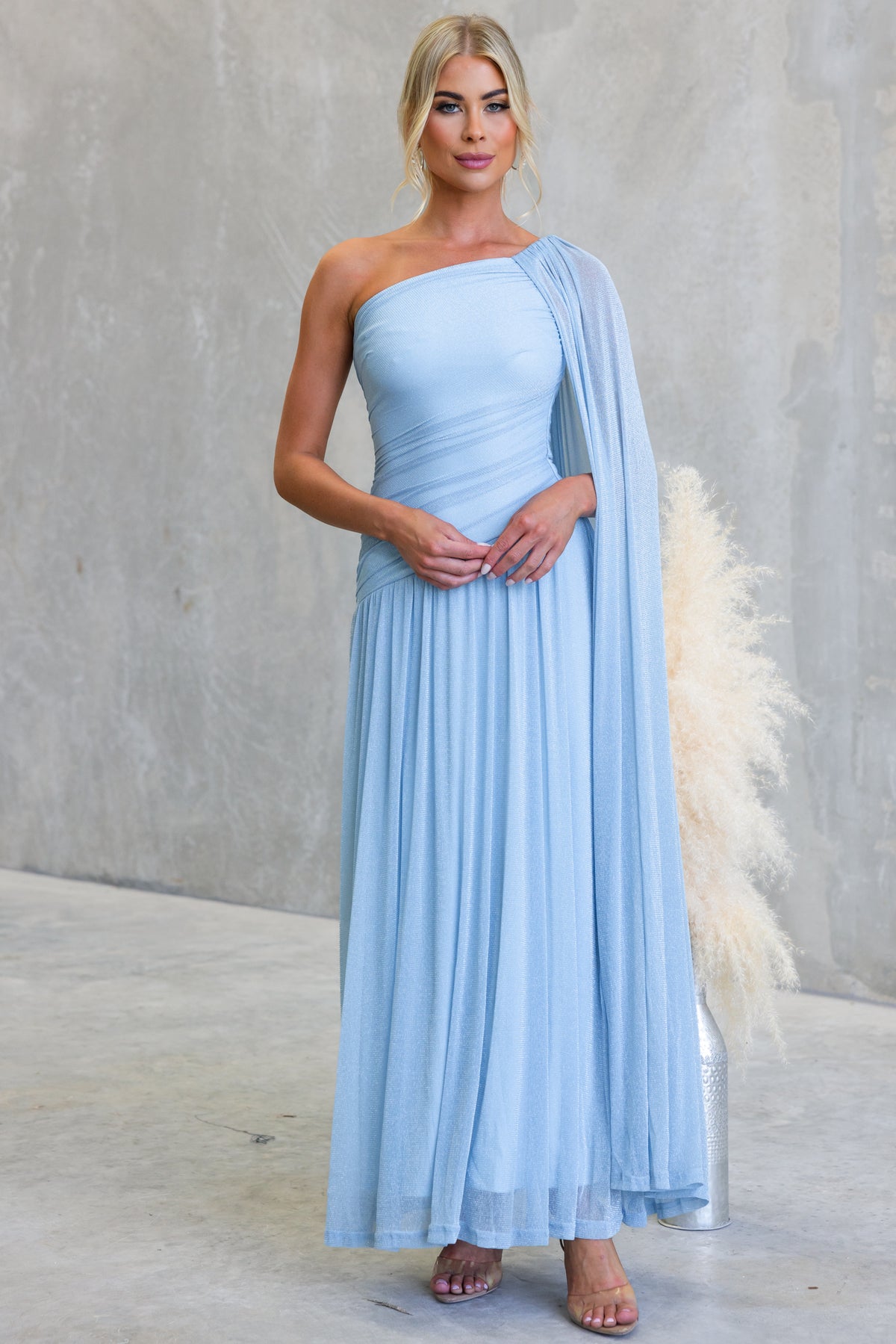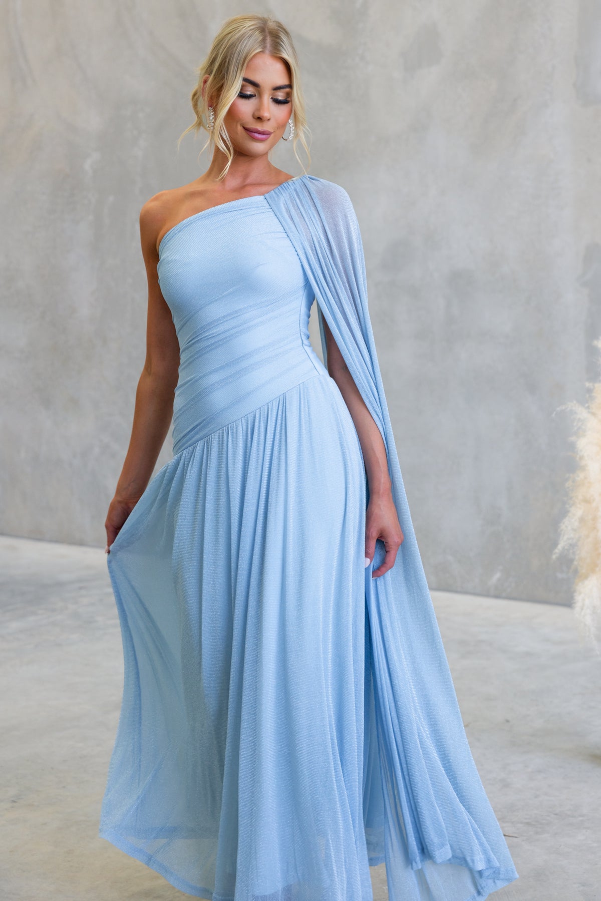 • One-shoulder neckline with drape